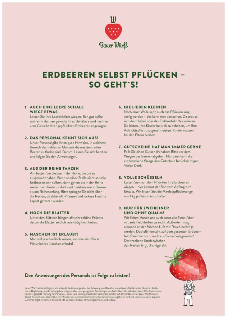 Wir rechnen mit Beginn der Erdbeerselbspflücksaison ab Ende Mai. Wir Informieren Sie umgehend, sowie wir die Felder öffnen werden.