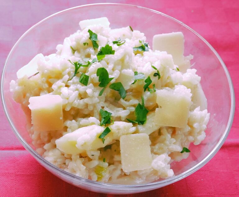 Die Schalotten halbieren, schälen und in feine Würfel schneiden. Den Spargel waschen, schälen und die Spargelspitzen in 2 cm Länge abschneiden. Den restlichen Spargel der Länge nach halbieren und in...