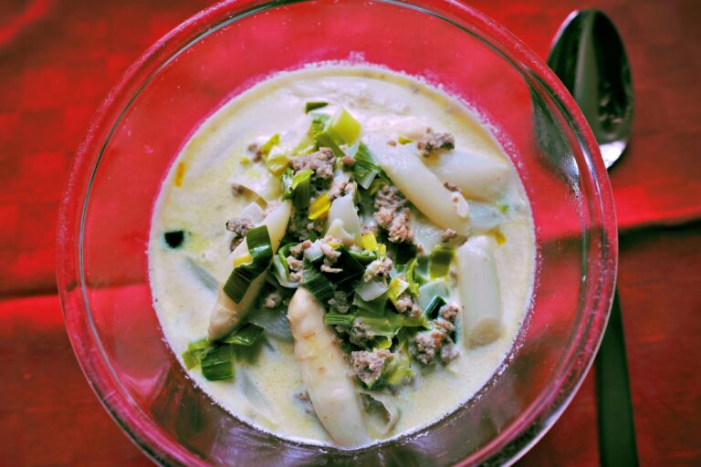 Das Hackfleisch in dem Öl anbraten. Den in Ringe geschnittenen Lauch und die Spargelstücke zugeben und unter rühren ca. 5 Min mitdünsten. Das Wasser (evtl auch einen Brühewürfel)hinzugeben und ca....