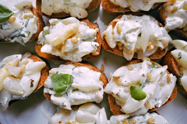 Spargel schälen, in mundgerechte Stücke schneiden, bissfest garen, abkühlen lassen.